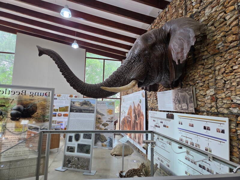 In diesem Areal konnte man sich noch frei bewegen. Ich führte Inge erst einmal in ein kleines Museum über die Geschichte des Parks und zu einem Beobachtungspunkt (Hide), wo sich bereits ein paar Elefanten an einer Wasserstelle aufhielten.