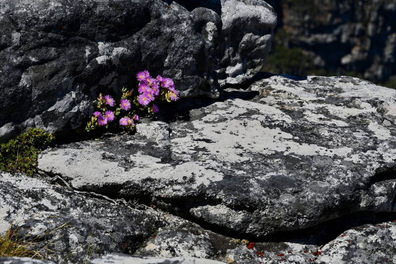 Die wenigsten Besucher machen hier eine Wanderung. Der höchste Punkt des Tafelbergs ist der Maclear's Beacon mit einer Höhe von 1.087 Metern, der sich am östlichen Ende seines flachen Plateaus befindet und nach dem Astronomen Sir Thomas Maclear benannt ist, der dort 1843 ein Leuchtfeuer errichtete. Wir machten uns zu Fuß auf, dieses Hochplateau zu erkunden. Neben Eidechsen und Dassies gab es hier eine tolle Pflanzenwelt. Darunter auch Pflanzen, die weltweit nur hier zu sehen waren.